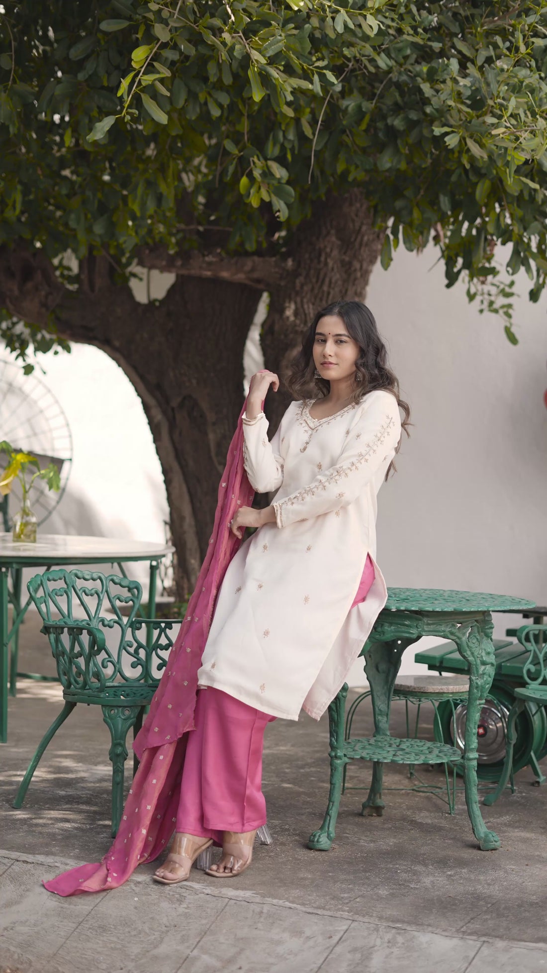 Women Kurta Pant Set-White and Pink, Festive & Wedding Wear